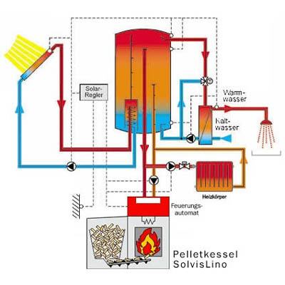 Die Solaranlage sorgt dafür, dass im Sommer und auch bei Heizbedarf in den Übergangszeiten der Kessel komplett abgeschaltet bleibt und je nach Auslegung 20% bis 30% Primärenergie zusätzlich eingespart werden können. Pelletheizungen sind nicht nur umweltfreundlich, durch den günstigen Preis für den Brennstoff Holzpellet sparen Sie bei den Betriebskosten Ihrer Heizungsanlage. Die höheren Investitionskosten werden durch die Bundesförderung für Biomassenutzung und die günstigen Kredite der KfW nahezu wettgemacht.