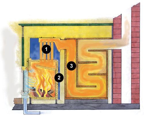 Der Schamottebrennraum erwärmt die Wände des Kesselkörpers und das darin befindliche Wasser. Kesselkörper und Wasserwärmetauscher bilden eine Baueinheit in der sich Heizwasser befindet. Durch beide Prozesse des Wärmeübergangs heizt sich das Wasser auf 70-80°C auf, wird in einem Pufferspeicher gesammelt und erwärmt bei Bedarf Heizkörper sowie Fußboden- und Wandflächenheizungen. Mit dem restlichen Anteil der Heizgase (3) wird z.B. eine Kachelwand erwärmt und sorgt für angenehme Strahlungswärme im Wohnraum.
