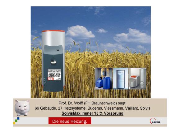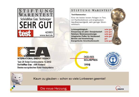 Weitere Qualifikationen: Norm-Emissionsfaktor weit unterhalb der Grenzwerte nach DIN 4702 und für das Umweltzeichen "Blauer Engel" Unterschreitung aller zur Zeit gültigen Grenzwerte. DGS/ISES Solarpreis 1998 (herausragendes technisches Solarprodukt): Im Juli 1998 wurde Solvis für die Entwicklung des SolvisMax Gas der Solarpreis 1998 verliehen. Die Deutsche Gesellschaft für Sonnenenergie e.V. und die International Solar Energy Society zeichneten das bisher einzigartige Produkt für die volle Integration von Solar- und Heizungstechnik aus.Auch Öko-Test beurteilte in der Ausgabe September '98 den SolvisMax Gas mit "empfehlenswert".DVGW-Zertifikat und DVGW-Qualitätszeichen "Gas" (QG-3112AT0007)StiWaTest 2003: Sehr GutEG-Baumusterprüfbescheinigung SolvisMax Öl (SÖ) CE 0085BN0388Die Entwicklung des SolvisMax Gas war auch ausschlaggebend für die Auszeichnung der Firma Solvis mit dem "Umweltpreis des Landes Niedersachsen 1998" für beispielhaftes Engagement im Klimaschutz.Die Entwicklung des SolvisMax wurde durch die Deutsche Bundesstiftung Umwelt unterstützt.